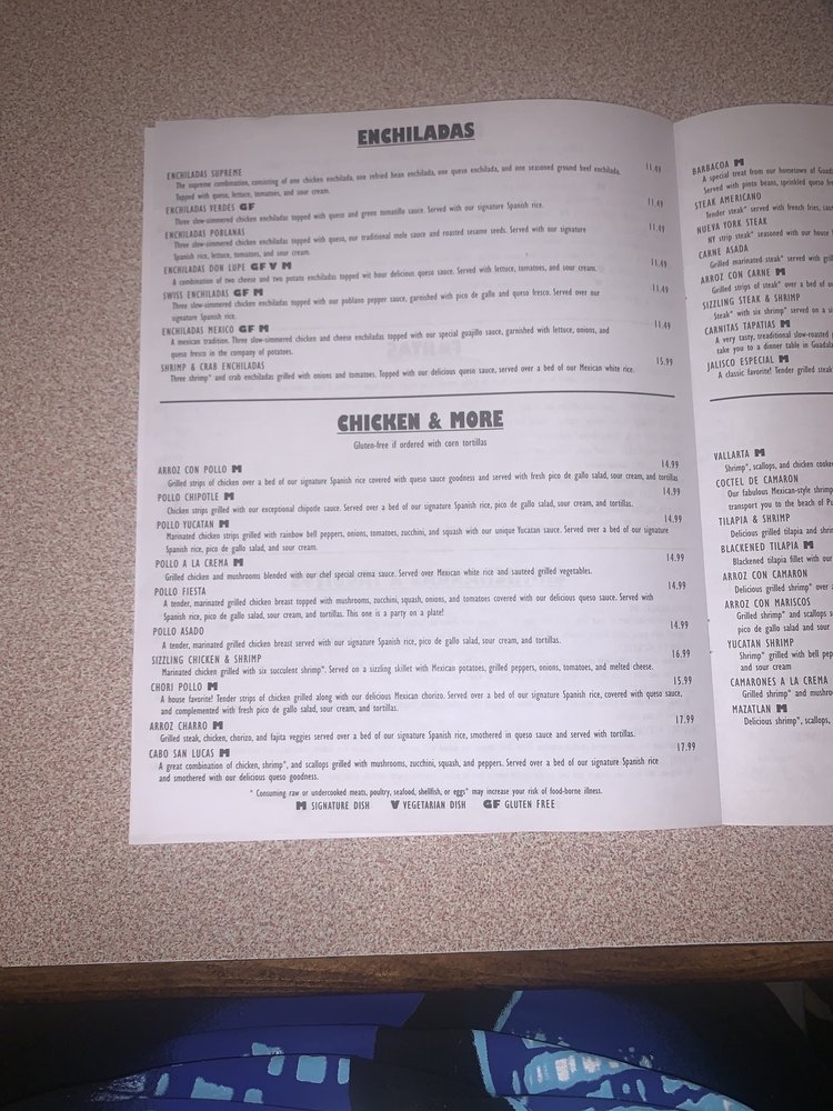 Delicious steak, chicken and chorizo grilled with onions, garnished with pico de gallo, served with signature Spanish rice, pinto beans and salsa picosa.".